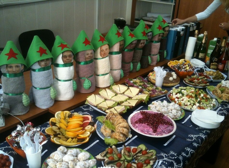 В результате вы не только произнесёте свои праздничные поздравления, но и продемонстрируете свои кулинарные таланты. Кроме того, посиделки в офисе избавят вас от необходимости дополнительных трат на кафе или ресторан. То же самое касается и блюд, приготовленных в домашних условиях, которые ничем не уступят покупным.