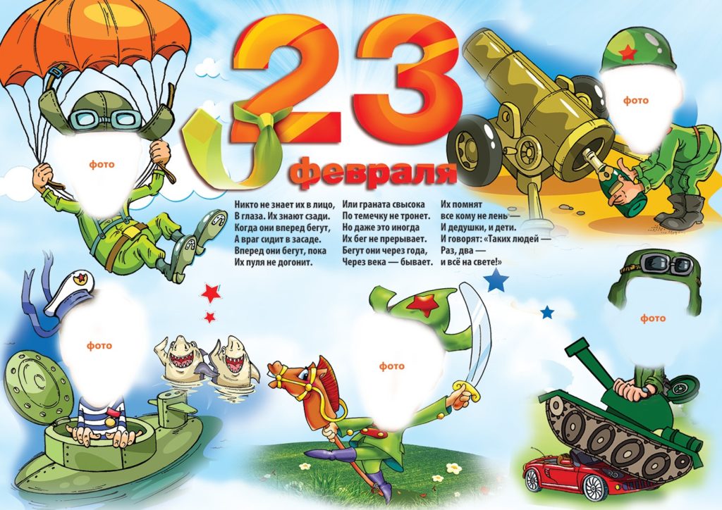 Фотоколлаж на 23 февраля — забавная идея для фотоальбомов, открыток и стенгазет