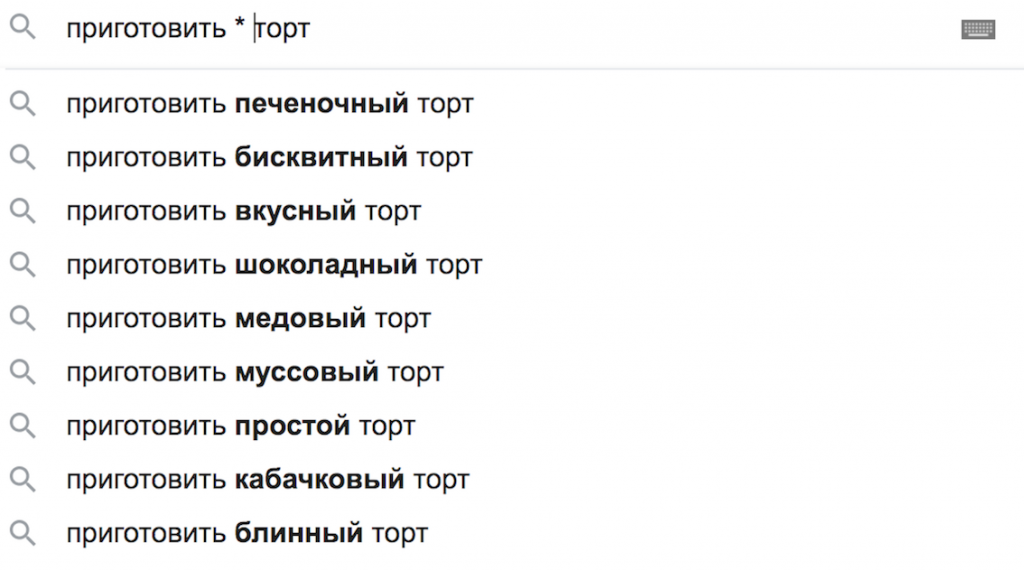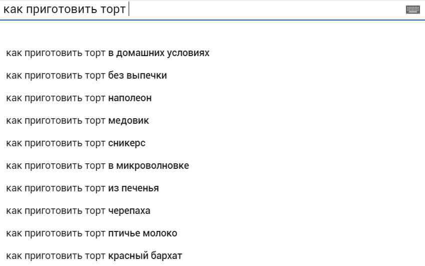 К примеру, вводите «Как приготовить…» и выпадает десять различных вариантов. Можно ввести запрос, касающийся вашей тематики, например «Как приготовить торт…» и выбрать то, что подойдет вам: «…торт без выпечки», «… торт в микроволновке», и.т.д.