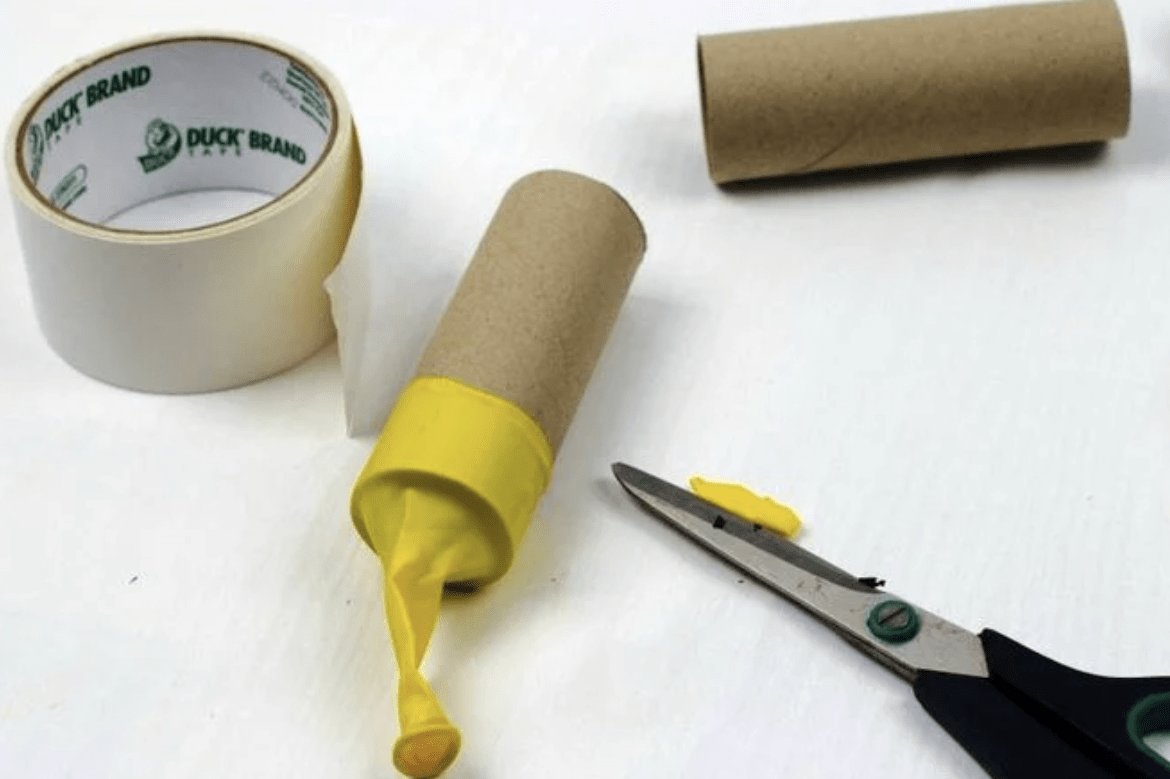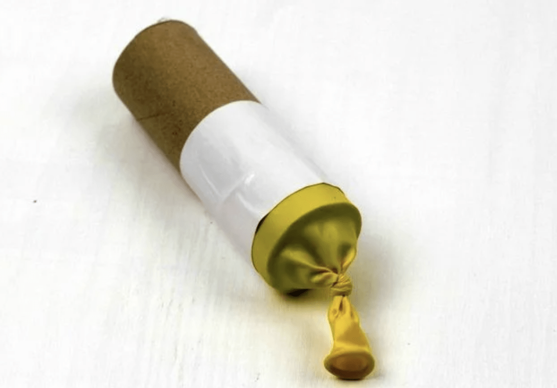 - Надеваем шарик на один конец трубки. Натягиваем до упора. Фиксируем шарик на цилиндре. Для этого можно использовать скотч, изоленту. Не жалейте материал, делайте несколько оборотов, чтобы шарик не выскочил во время выстрела. Для дополнительной надежности можно еще одеть канцелярскую резинку в два-три оборота.Если нет под рукой втулки, можно самостоятельно сделать цилиндр из плотного картона. Он должен хорошо держать форму. Склеить картон можно скотчем по кругу, чтобы он не развалился во время использования.