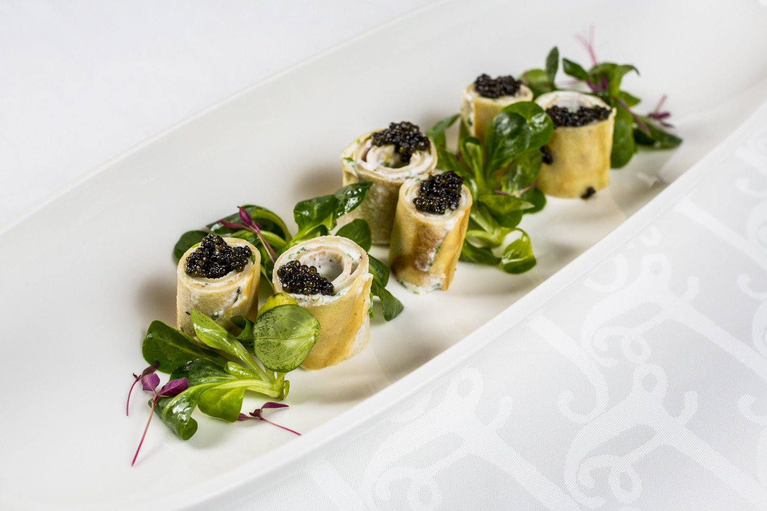Смешать козий сыр, с мелконарезанным луком-сибулет, лимонным соком, медом и сливками. Получившуюся начинку выложить по всей поверхности блина, свернуть в рулет и нарезать. Каждый кусочек украсить черной икрой. Получается очень необычный вкус, это надо пробовать!