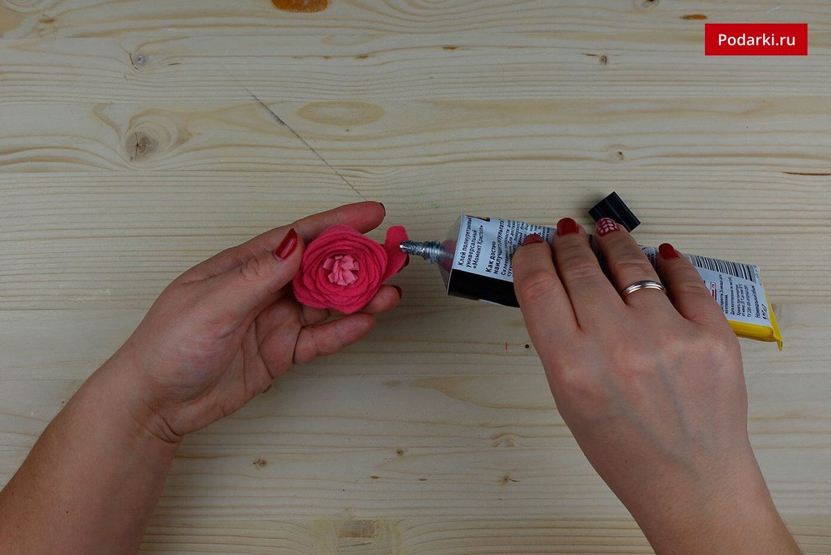 Когда клей подсохнет, приклеиваем на фетровую основу булавку или резинку.