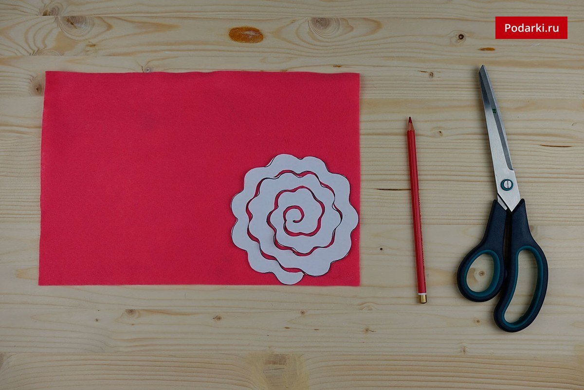 Переносим шаблон цветка на фетр розового цвета. При желании можно выбрать любой другой оттенок.