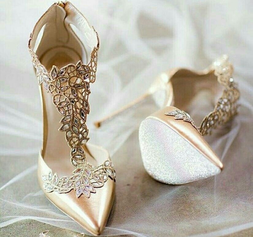Выбирайте такие туфли с осторожностью: они сами по себе являются ярчайшим акцентом, поэтому будут соседствовать с минималистичной юбкой свадебного платья. Поддержать тему блеска и сияния вы можете 1-2 аксессуарами где-нибудь в районе головы, и этого будет достаточно