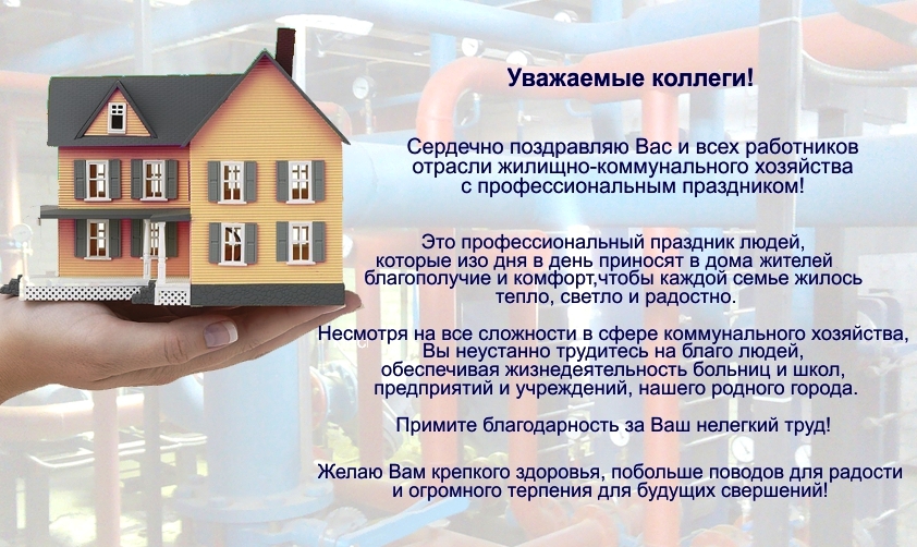 «Поздравляем с профессиональным праздником тех, кто ежедневно лицом к лицу сталкивается с проблемами и трудностями ЖКХ, кто стойко, мужественно и ответственно решает даже самые сложные задачи! Ваша работа нужна нам, и мы сердечно благодарим вас за труд! Разрешите пожелать вам здоровья, благополучия, профессиональных успехов, личного счастья»!