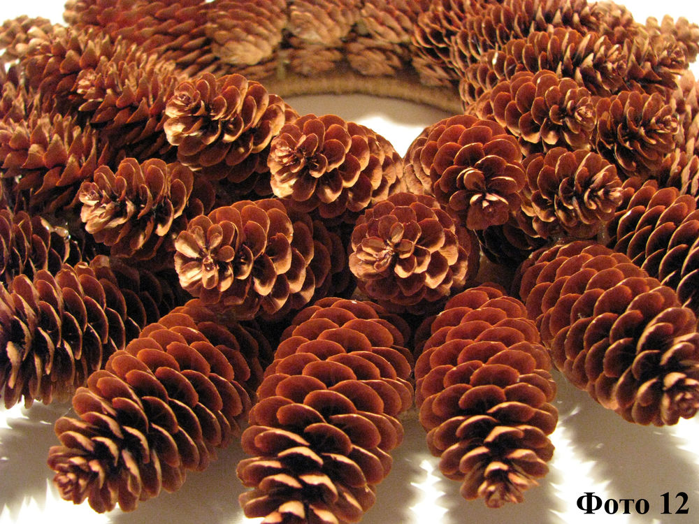 Следующий вариант оформления венка больше соответствует модным тенденциям. Все потому, что для него используется натуральный материал, а именно шишки.