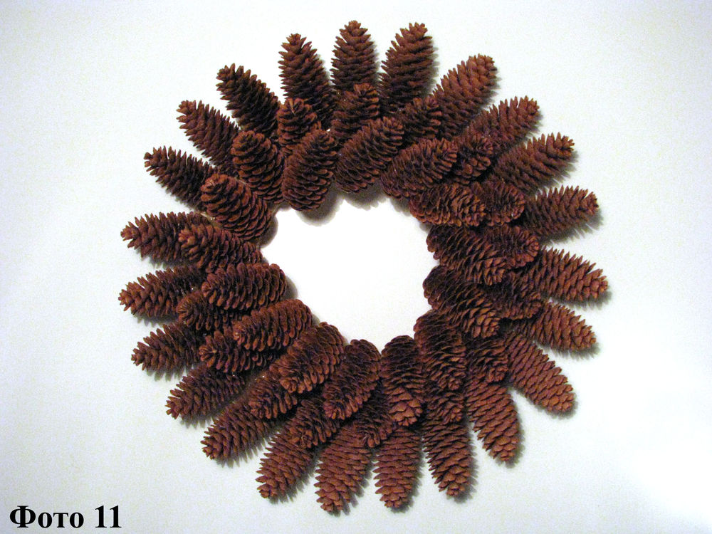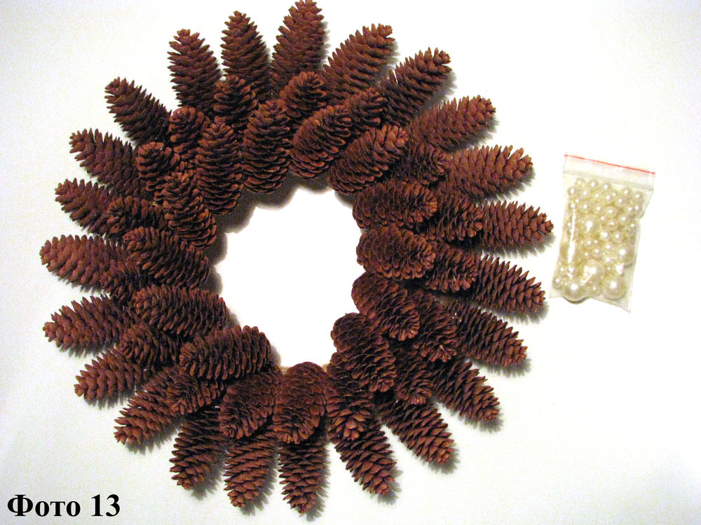Закрепляем шишки у внешнего круга основы, используя клеевой пистолет.