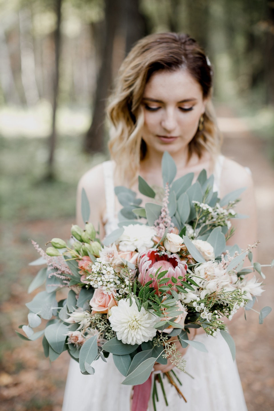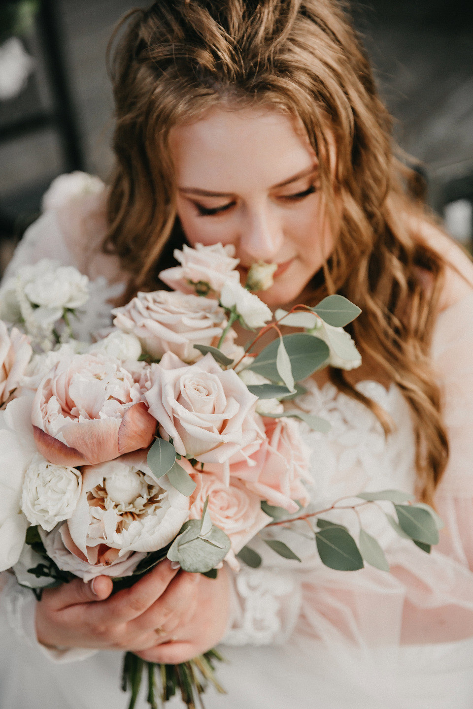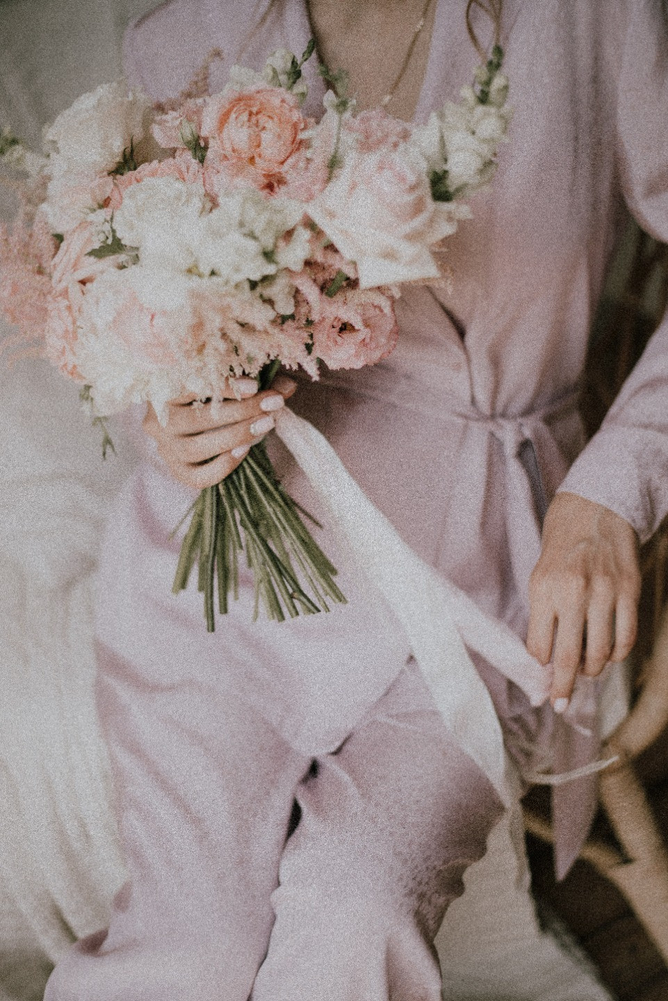 Букет невесты – еще одна возможность поиграть с оттенками и поддержать цветовое решение подвенечного наряда. Оригинальным и одновременно роскошным выглядит сочетание белых и очень темных цветов. Если такое смелое решение не подходит, добавьте к светлому букету небольшое темное украшение (ленту, бусины или перышки). Если вы не имеете опыта удачного сочетания родственно-контрастных цветов, доверьте это дело стилисту.