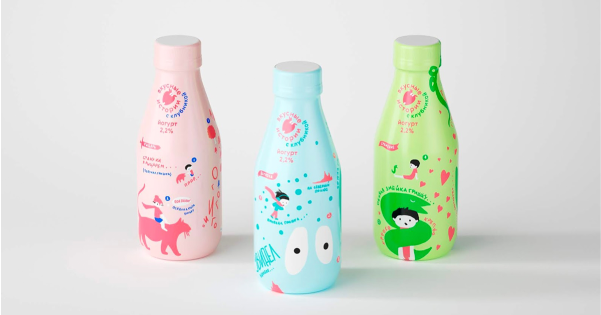 кормление ребенка веселой игрой с помощью бутылочки йогурта со сказкой про