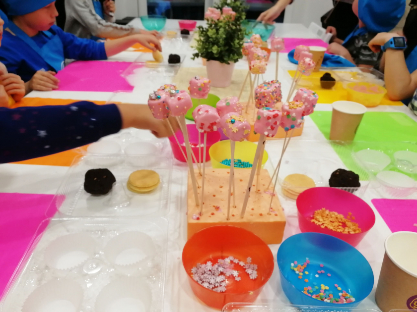“На мастер-классе дети делают 4 кондитерских шедевра: маршмеллоу в шоколадной глазури, бисквитное пирожное со сливочным кремом, кейк-боллс в кокосовой стружке и фигурный шоколад!”