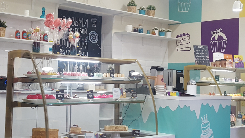 “Постояв минуты две и поразглядывав вывеску, мы попадаем в наполненное светом, безумно яркое и насыщенное цветом, в желто-фиолетово-бирюзовой цветовой гамме, красивое помещение. Там нас встречает приветливый продавец десертов,а также две больших витрины с разнообразными лакомствами на любой вкус…Глаза разбегаются…Так все красиво и аппетитно…”