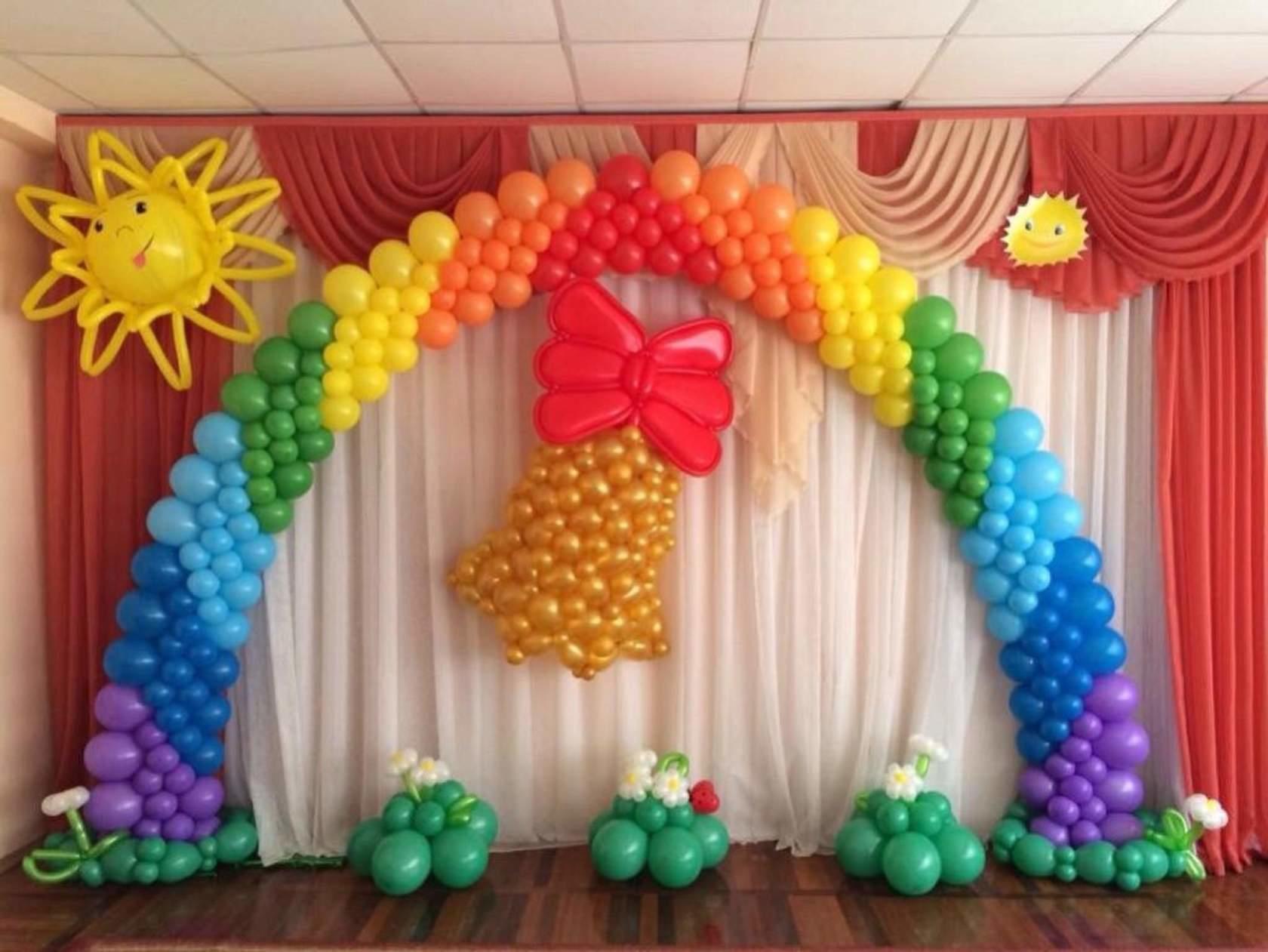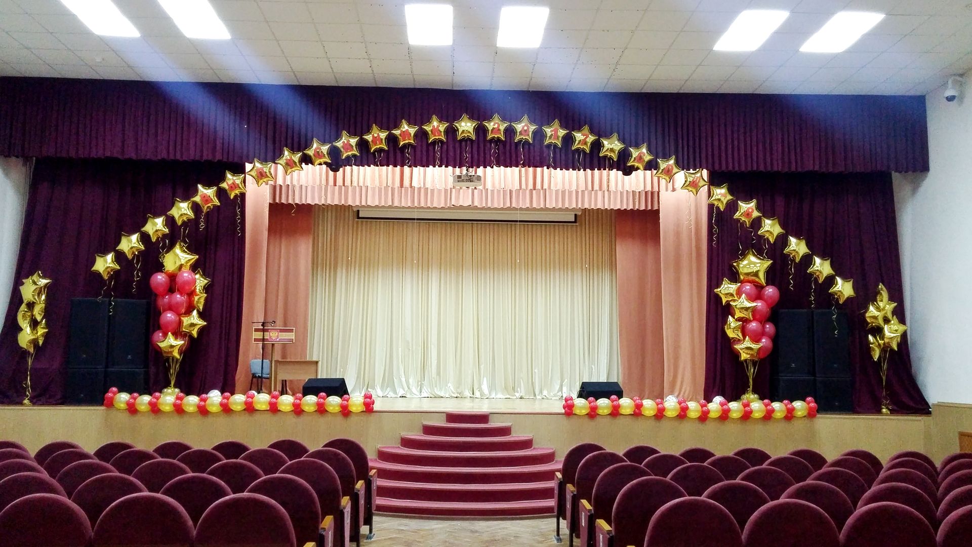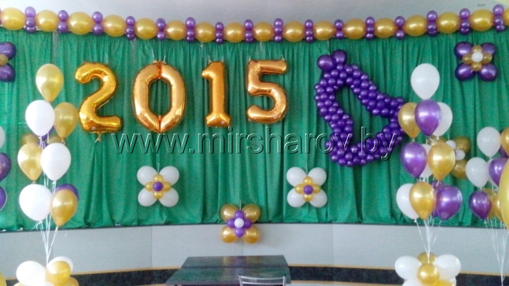Шары – самый популярный элемент украшения зала. Очень красиво смотреться арки из шаров. Их можно расположить возле сцены зала либо у входа в зал.
