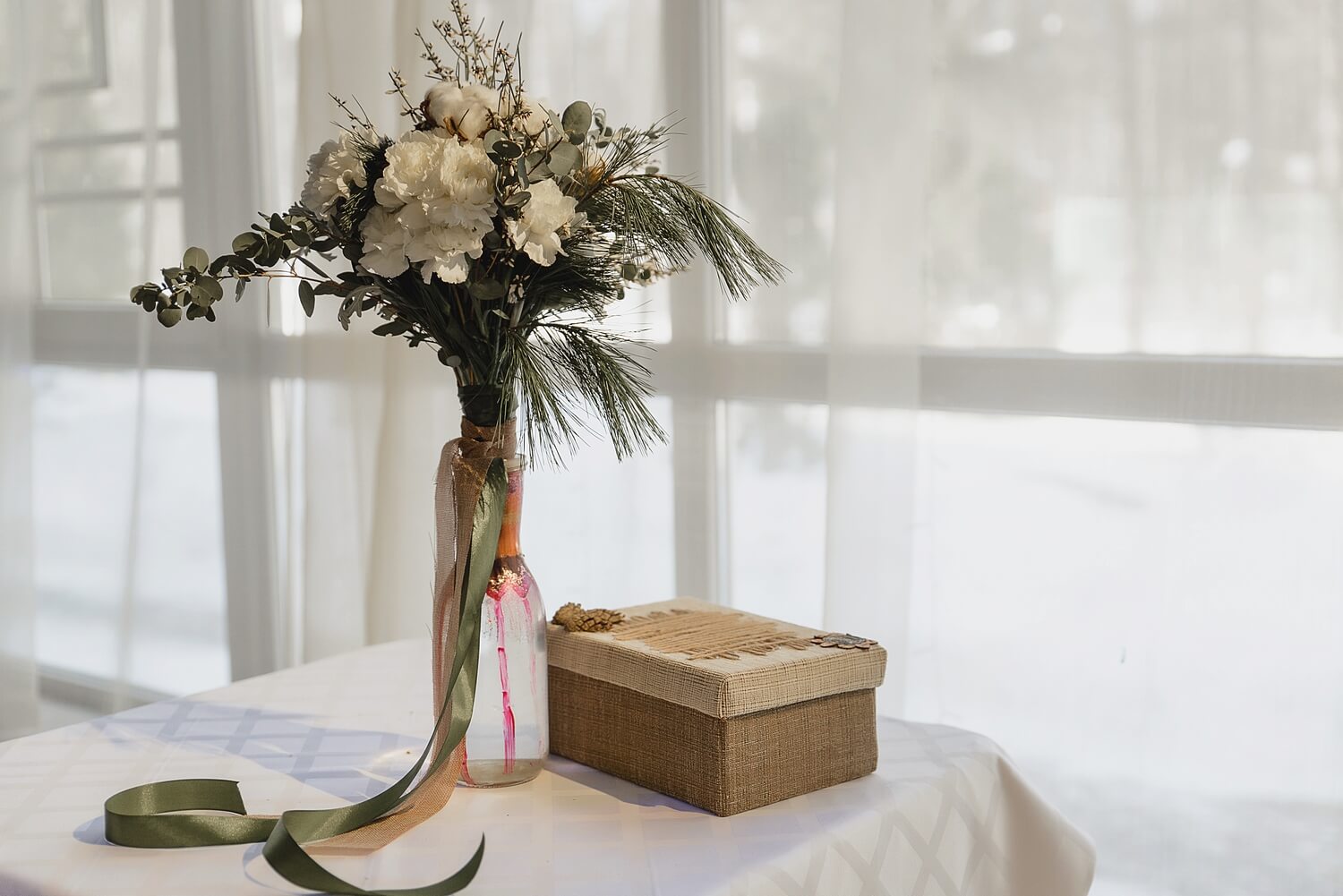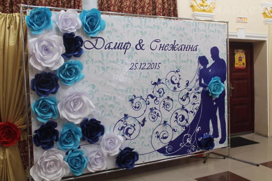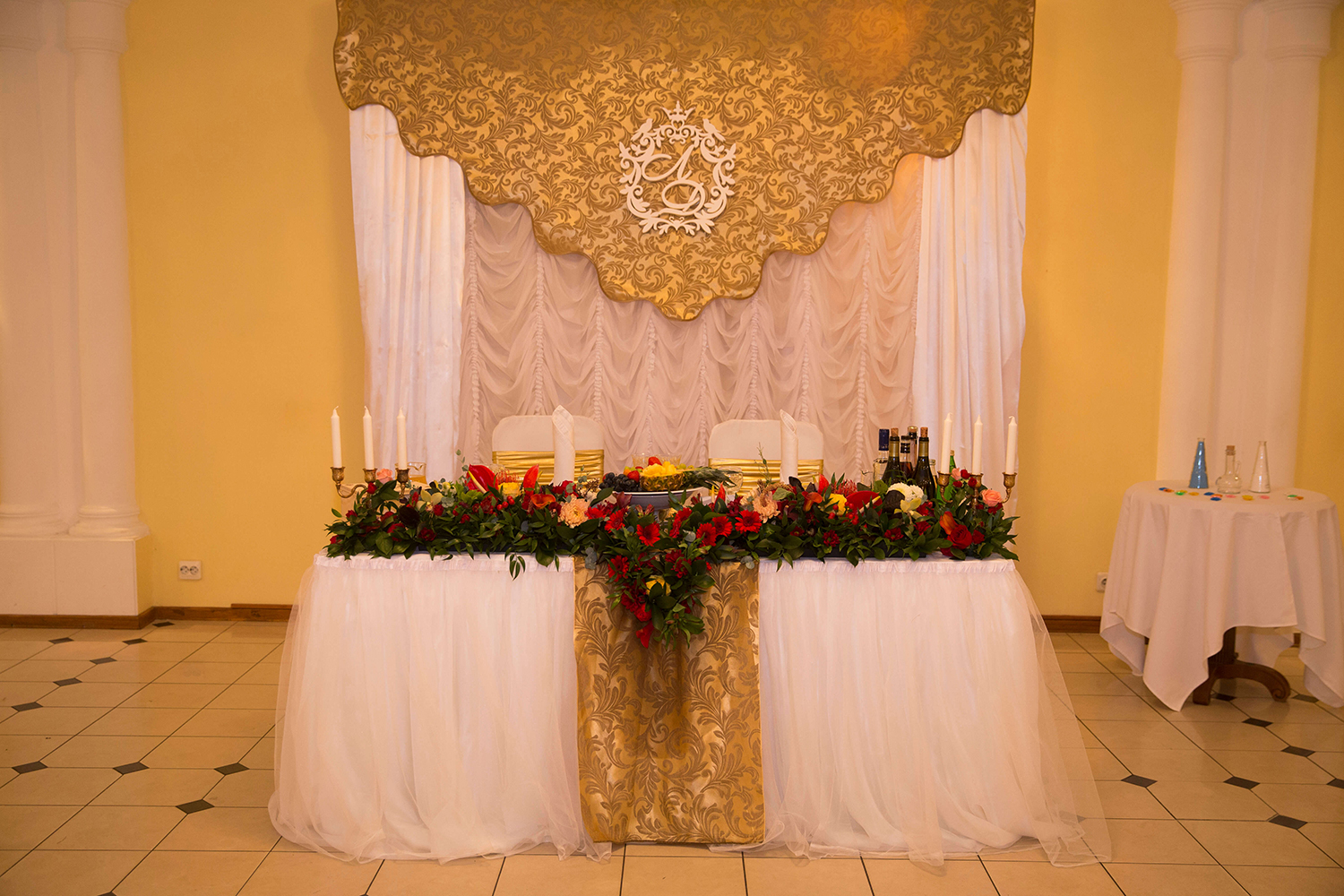 - Буквы, являющиеся инициалами молодых, могут быть расположены на заднике или на шторах, если стол находится у окна.