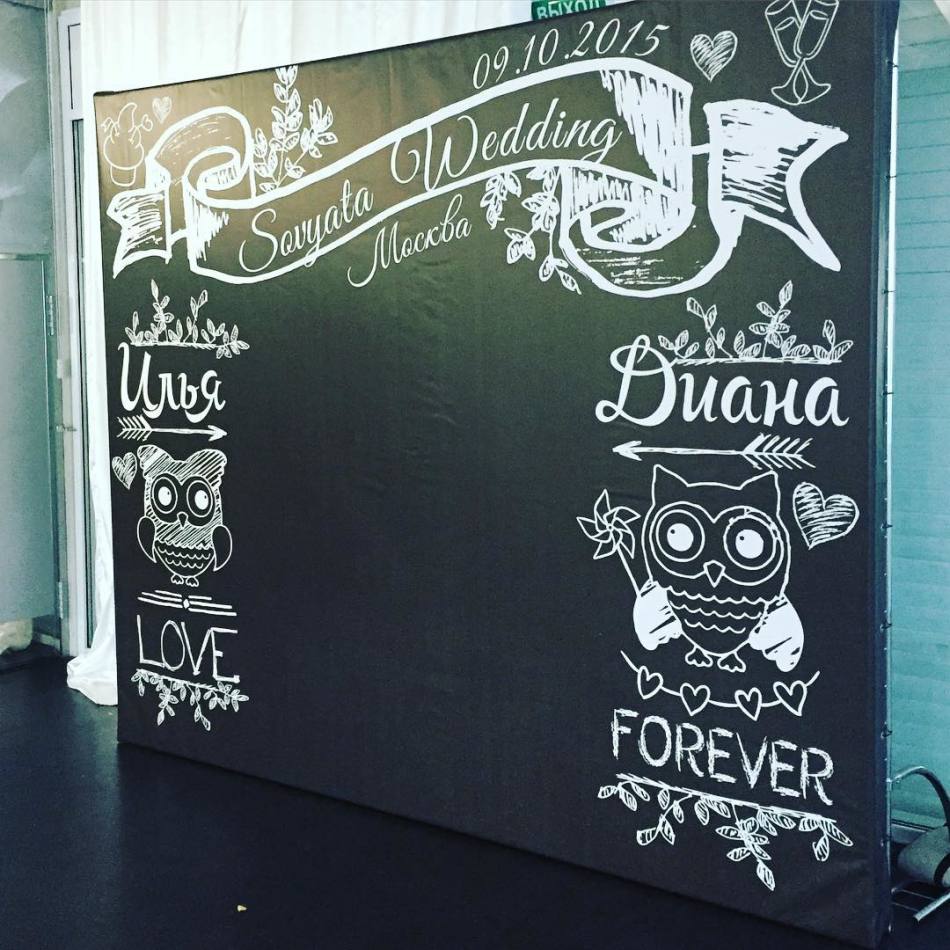 Хотите оригинальное современное оформление? Купите грифельную доску и напишите на ней план рассадки гостей или их список, в общем, всё, что пожелаете. Здесь главное — идея, а реализация за вами. Кстати, аренда доски стоит от 300 руб.