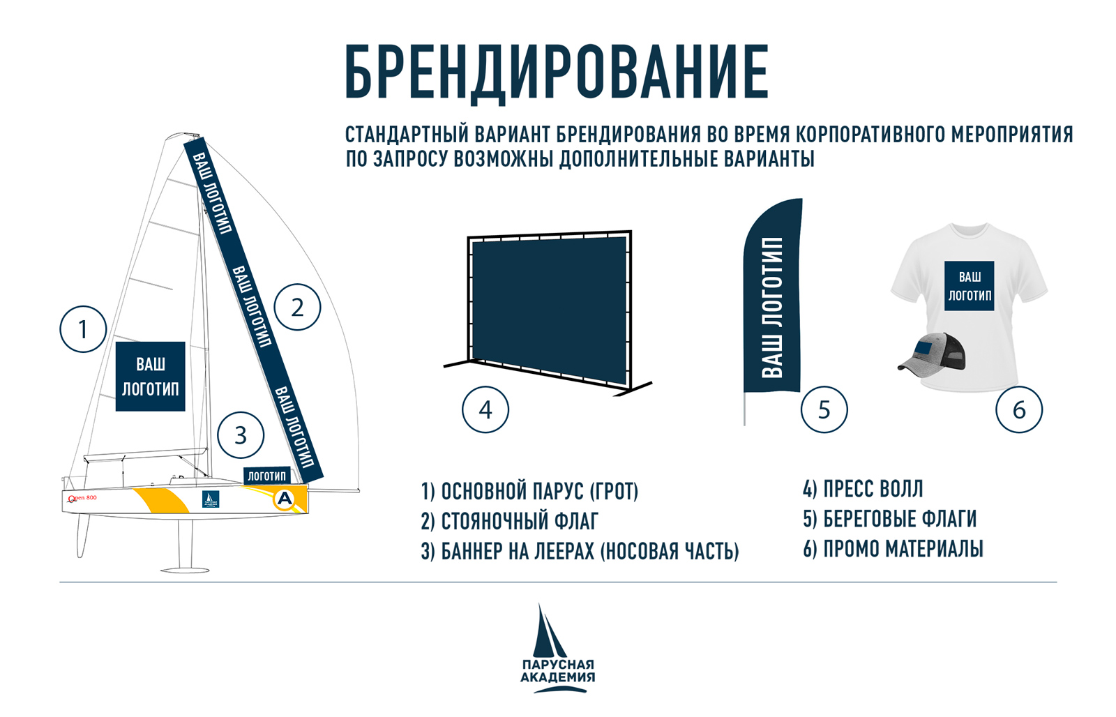 Парусная академия предлагает Вам широкие возможности для размещения Вашего бренда во время проведения корпоративной регаты – паруса и баннеры, флаги и бренд-воллы. Выбирайте лучшее!