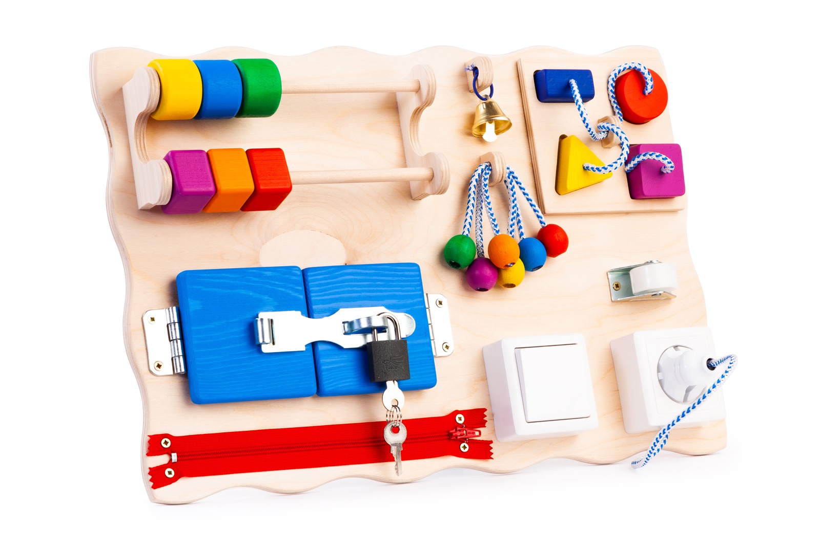 Бизиборд — пользуется невероятной популярностью. Предмет не зря в списке подарков, он представляет собой доску, на которой крепятся разные мелочи. Замок, выключатель, звонок, дверные ручки и кнопки