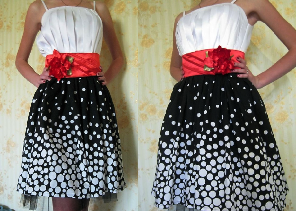 Недорогое, но очень эффектное платье можно сшить своими руками на выпускной вечер. Сочетание классических оттенков всегда будет в моде, а веселый горошек добавляет наряду игривости.