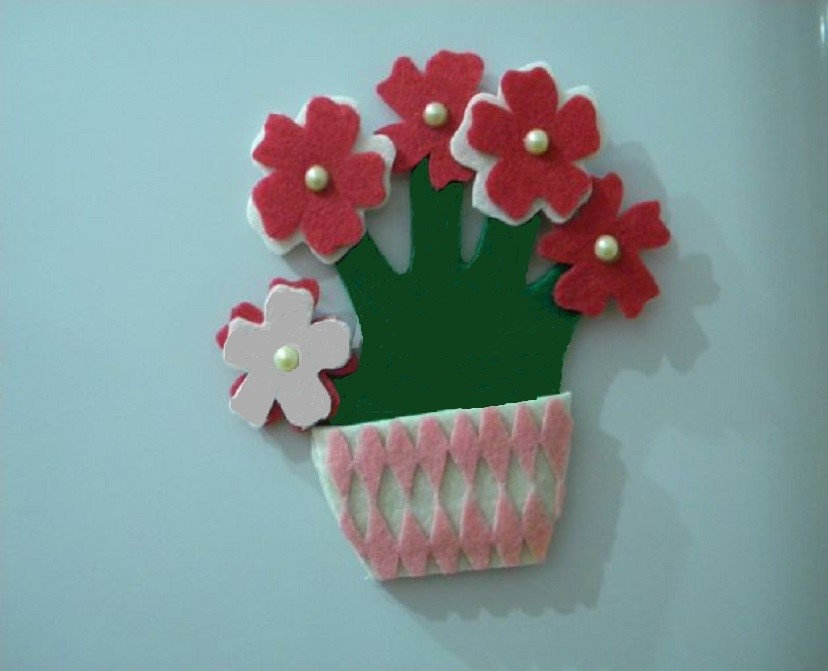 Для начала стоит заняться шаблонами, на ткани нарисовать руку, можно обвести собственную, но так, чтобы пальцы были максимально разомкнуты. Также нужно сделать две вазочки из фетра или горшочки, 10 деталей цветков, 5 из них сделать большими, а остальные 5 чуть меньше.