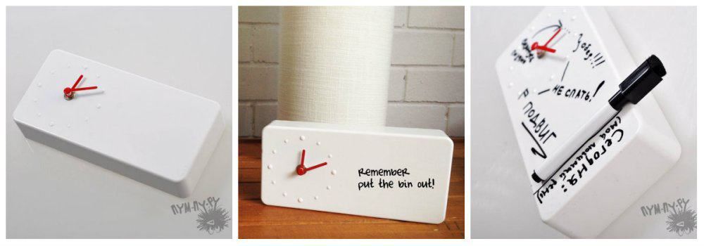 Рисовать можно не только на кружке, но и на часах. С помощью маркера именинник легко будет создавать наброски и целые шаржи, каждый день по-новому оформляя свой необычный подарок. С такими часами точно нельзя проспать работу! Подробнее>>