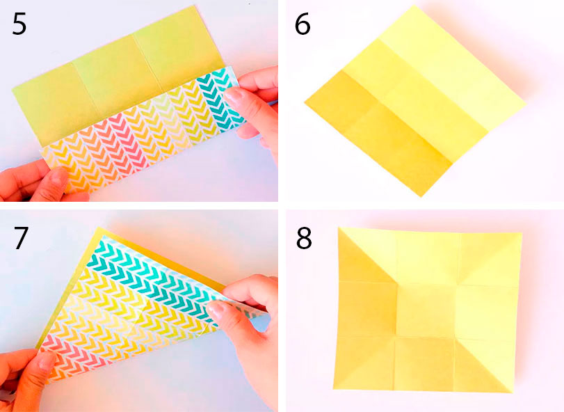 - Лист (должен быть квадратной формы) необходимо сложить в горизонтальное положение, затем согнуть вертикально;