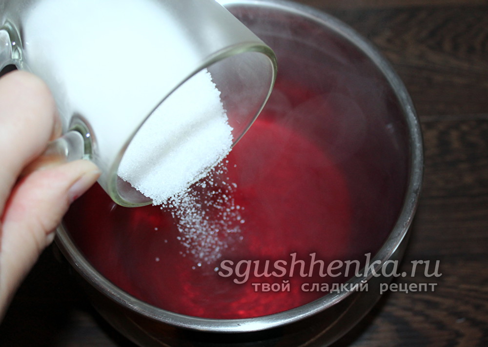 - Процедите жидкость и снова перелейте в кастрюлю. Добавьте к ней сахар.