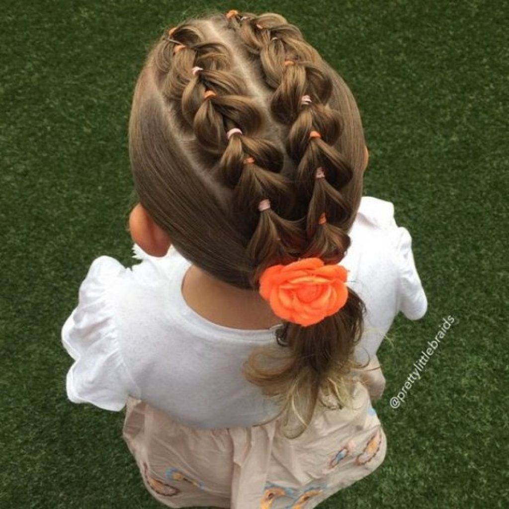 Еще один вариант, который прекрасно подойдет даже для самых юных леди, которым едва исполнилось 2 годика. Изюминка этой прически – необычный волнообразный пробор. Основание косичек-колосков обмотано прядью волос, что выглядит необычно и стильно.