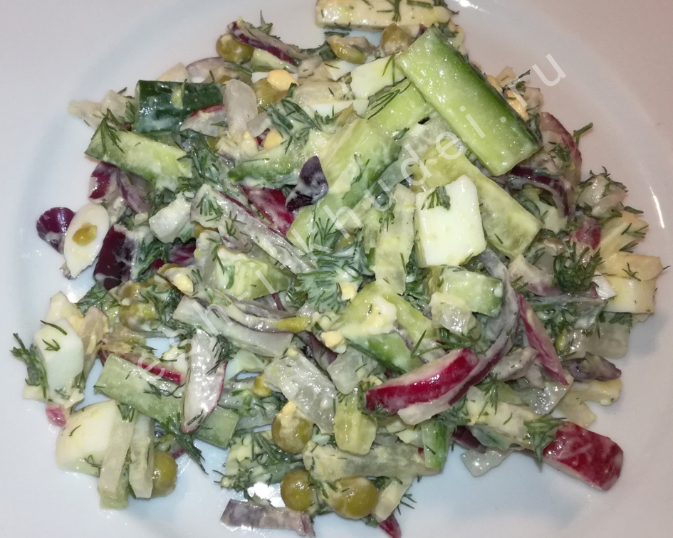 Это недорогой салатик отлично подходит в качестве закуски на праздничный стол. Он готовится без майонеза. Салат подходит для тех, кто придерживается вегетарианской диеты, а также как гарнир к мясу.
