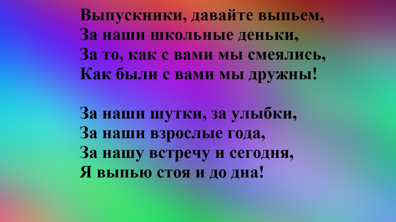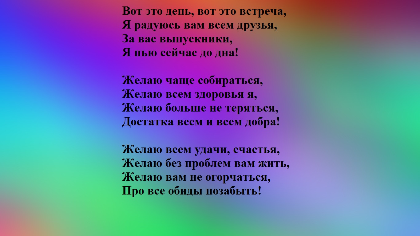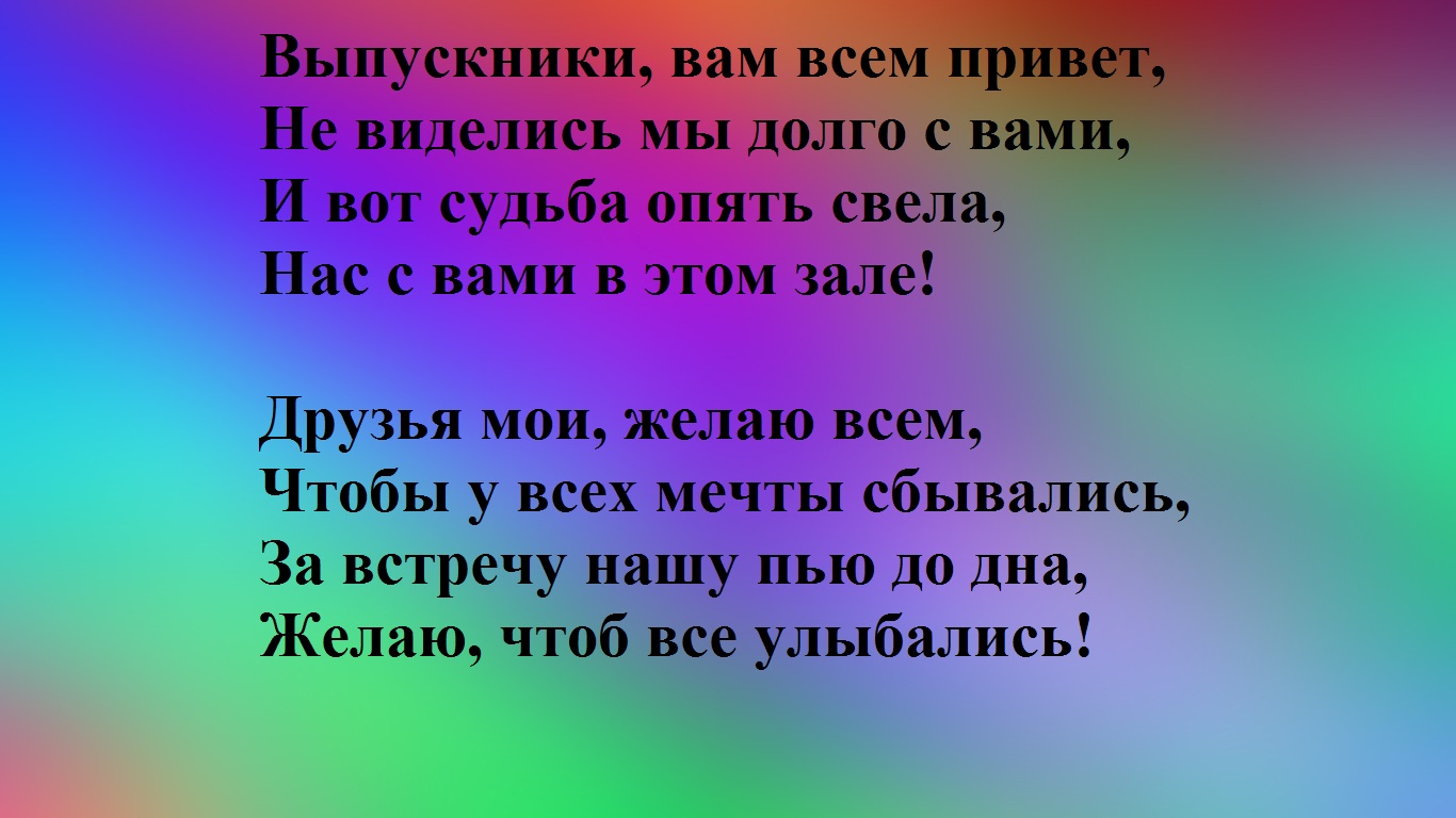 - Мои одноклассники, как это замечательно – встретиться спустя определенное время и вспомнить свои веселые детские годы. Никто так не может разделить воспоминания о прошлой жизни, как вы, которые также четко их помнят. Давайте встречаться чаще, чтобы, вспоминая молодость, погружаться в беззаботные воспоминания и поднимать себе настроение и душой молодеть (хоть она у нас еще не стара!).
