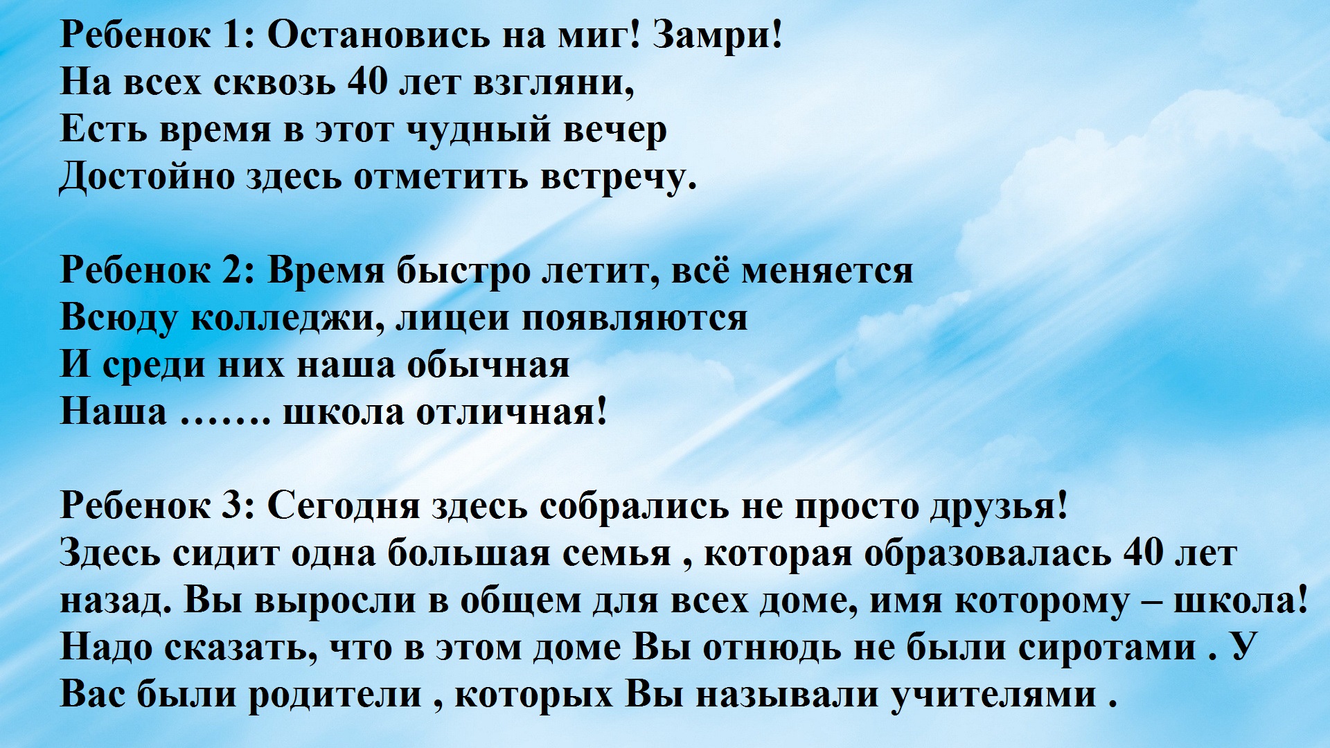 Ведущий: Радостно видеть ваши лица, по которым видно, что вы все свои и были когда-то дружной школьной семьей. Сегодня вы встретились, чтобы окунуться в воспоминания на 40 лет назад, когда вы ушли со школьного порога во взрослую жизнь.Выступают ученики школы с песней «Детство».