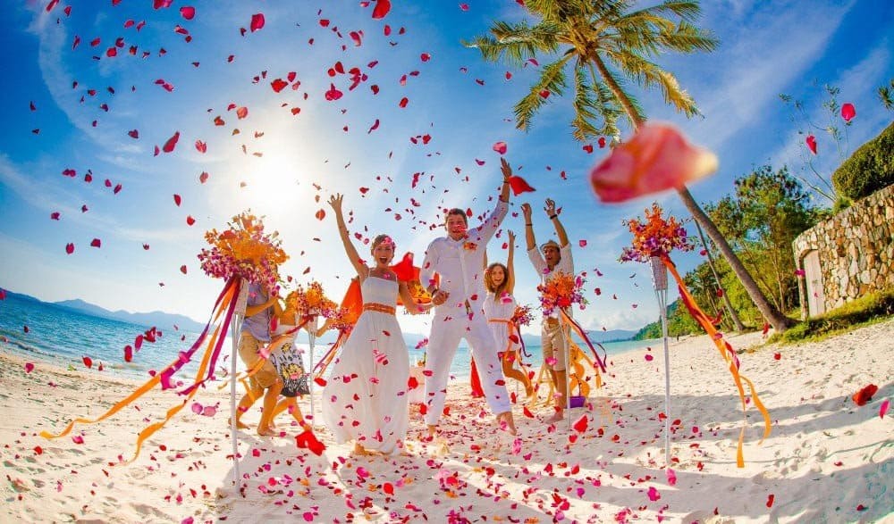 Эта свадьба может включать элементы церемонии в европейском или в гавайском стиле, взять водный тайский ритуал или быть абсолютно дикой, под стать природе.