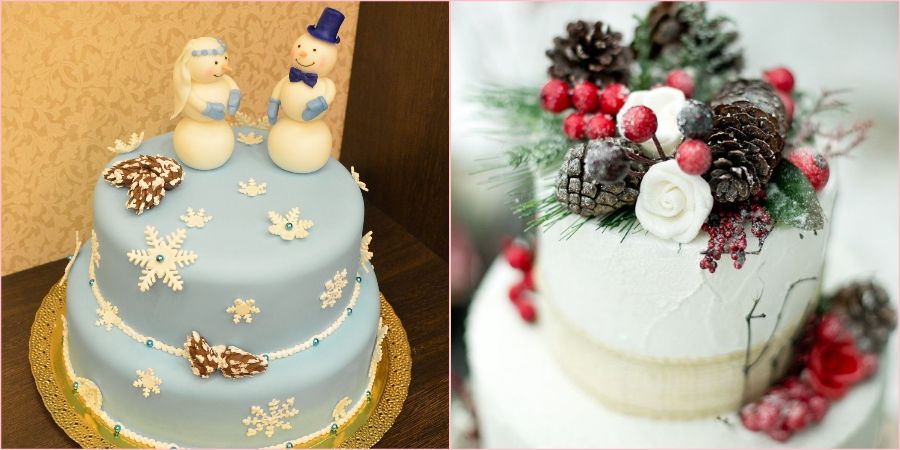 Свадебный торт может быть декорирован снеговиками, снежинками и шишками.