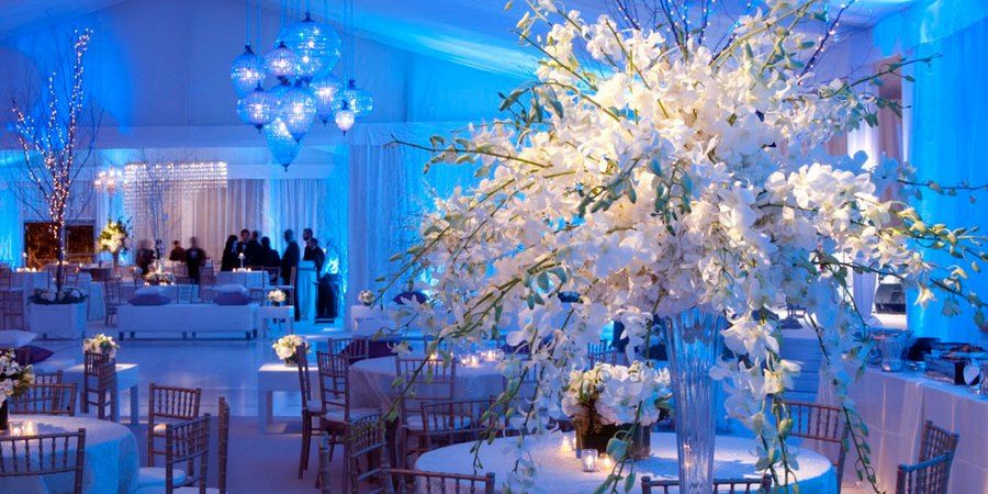 Если свадьба тематическая, зал может быть оформлен в соответствии со сказочным сюжетом, к примеру, в виде дворца Снежной королевы.