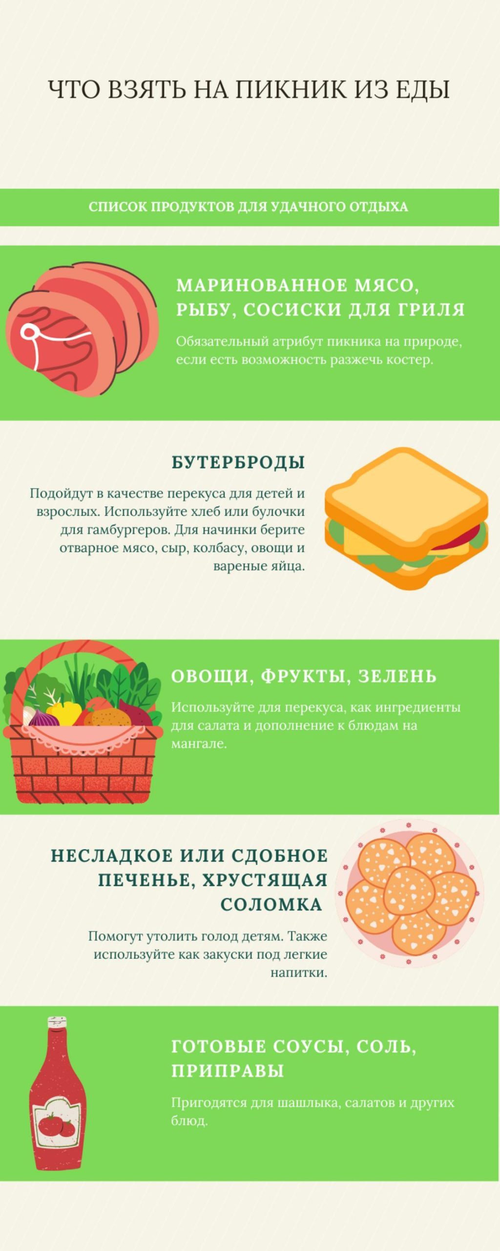 Пусть ваш пикник проходит весело и интересно. Не забывайте, что возможность отдохнуть на природе — это не только повод наестся и напиться. Попробуйте в этот раз едой просто разнообразить интересную духовную беседу, музыкальный вечер или дружеские ностальгические посиделки.