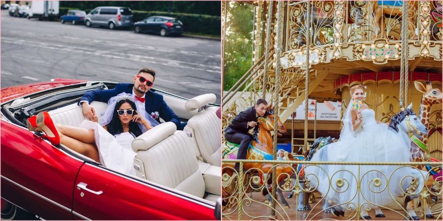 Еще одна отличная идея торжества для двоих – прогулка по любимым местам в городе. И кто сказал, что делать это нужно обязательно пешком, ведь можно арендовать дорогую иномарку с открытой крышей или ретро-авто. Летом отличным решением станет посещение парка аттракционов, там получатся очень живые и эмоциональные кадры.