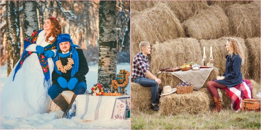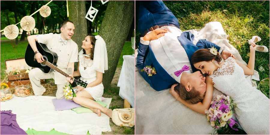 В качестве аксессуаров используйте плетеные корзины, бутерброды, цветной дым, солнечные очки, воздушные шары, зонтики, пледы, свечи. Все будет зависеть от времени года Вашей свадьбы. Можно поиграть на гитаре, развести костер, пойти по грибы или ягоды.
