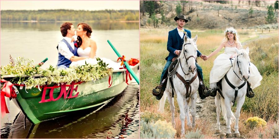 Можно прокатиться в лодочке или на лошадях, спортивным парам наверняка приглянется активный отдых, например, катание на велосипеде или роликах, можно организовать свою церемонию на крыше какой-нибудь высотки или в горах. В общем, фантазируйте, идей куча, стоит лишь определиться, как именно Вы хотите отметить свой день.