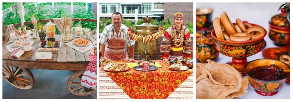 Стены закрывают медвежьей шкурой, круглыми подносами или бабушкиными платками под народный стиль. Также развешивают по углам и стенам помещения связки лука и баранок, композиции из рябиновых ягод и еловых лап. На столе выставляют начищенный до блеска самовар, кадки, бочонки, плетеную утварь, еду и питье подают в глиняной и деревянной посуде.