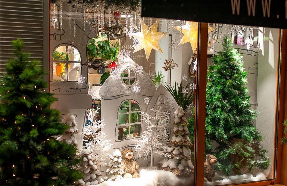 Собственники магазинов, кафе и ресторанов, салонов и прочих предприятий, связанных с обслуживанием клиентов, тщательно продумывают декор витрин и украшают их стильно и креативно. Чтобы выделиться среди конкурентов, а также подарить своим клиентам новогоднее настроение, они используют тематические цветные наклейки на стекла, декор из бумаги, новогодние атрибуты (это, конечно же, красавица-елка, новогодние снежинки, Дедушка Мороз), украшения в стили «хенд-мейд».