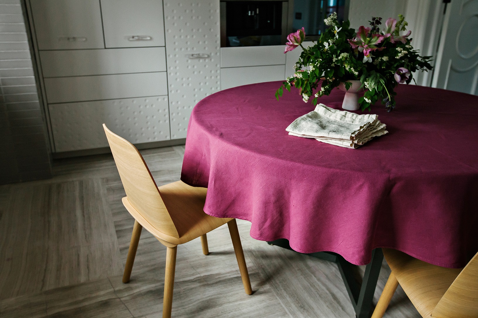 - Скатерть нужно тщательно выгладить и аккуратно застелить (никаких клеенок). Ее углы равномерно опускаются возле ножек, закрывая их не менее чем на 25 см, но не ниже колен сидящего человека.