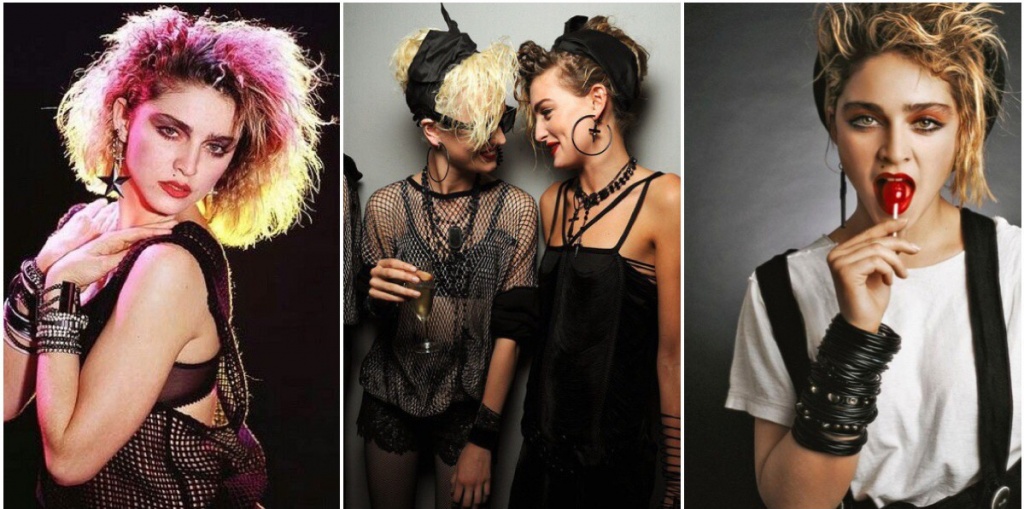 Если ты уверенная, дерзкая и эпатажная, примерь на себя образ Мадонны – секс символа 80-90-х. Круто, если в твоём шкафу имеется кожаная куртка-косуха. Дополни её перчатками, броской бижутерией и яркими аксессуарами. Как сделать макияж в стиле Мадонны смотри тут.