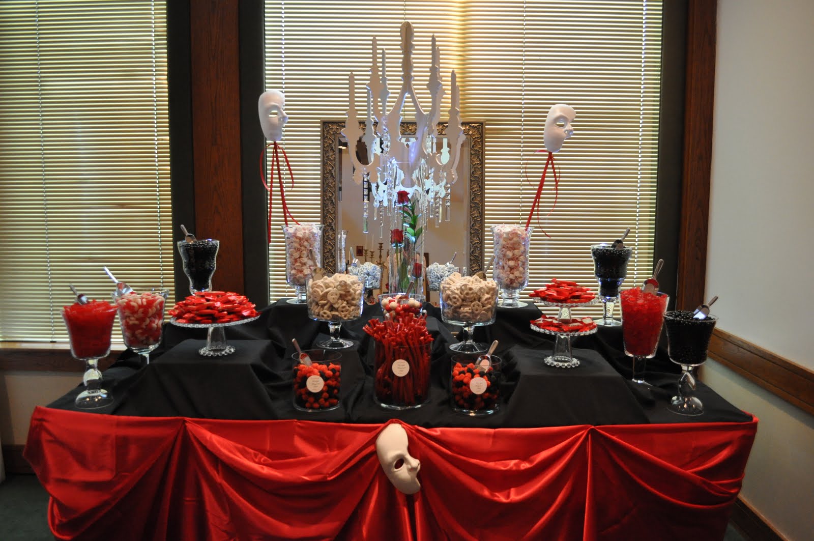 Самый простой, но эффектный вариант – это белая скатерть, вазочками с красными цветами или лепестками и подсвечники с красными и чёрными свечами. Посуда – только белая или чёрная.