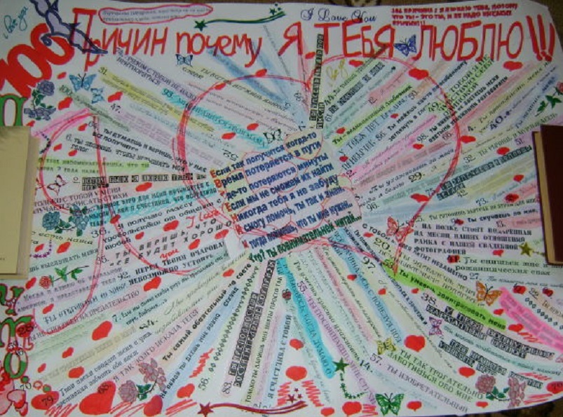 Проще всего сделать плакат «Сто причин, почему я тебя люблю» и написать на нём все причины по порядку. Конечно, для этого потребуется время и старания, чтобы красиво вывести каждую букву, но именно благодаря затраченным усилиям, такой подарок будет очень дорог её сердцу.